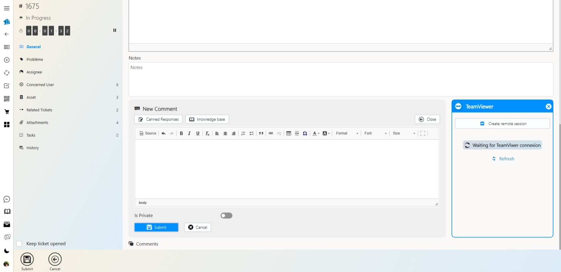 SimplyDesk permet de lancer une session à distance directement depuis un ticket via TeamViewer, RDP ou MSRA, sans ressaisie d’informations techniques.
