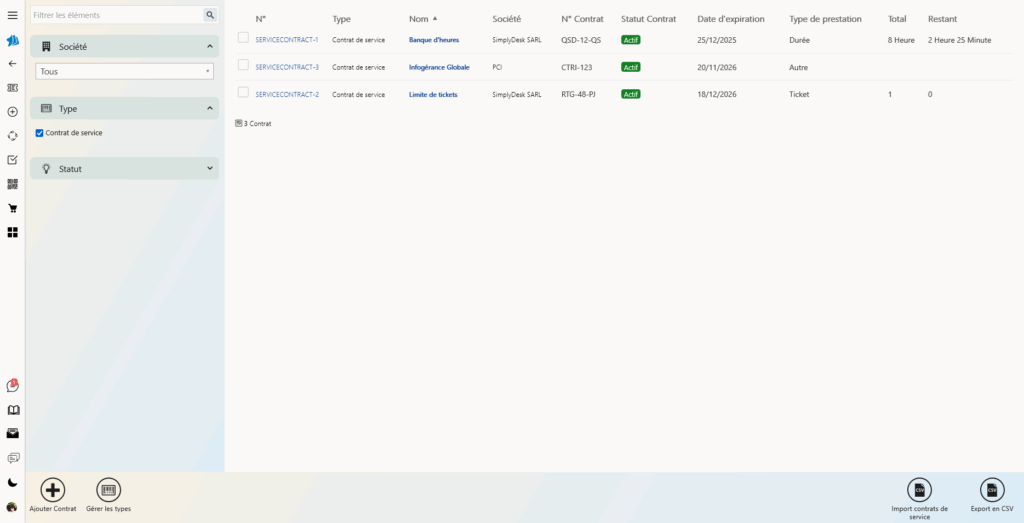 Le contrat de service dans l’outil helpdesk SimplyDesk est un élément central de la gestion ITSM. Il permet de formaliser les engagements entre le service informatique et ses utilisateurs en définissant les conditions d’intervention, les plages horaires, les niveaux de priorité, et les services concernés. Ce module assure une meilleure visibilité sur les prestations offertes et facilite la gestion des attentes des utilisateurs.
