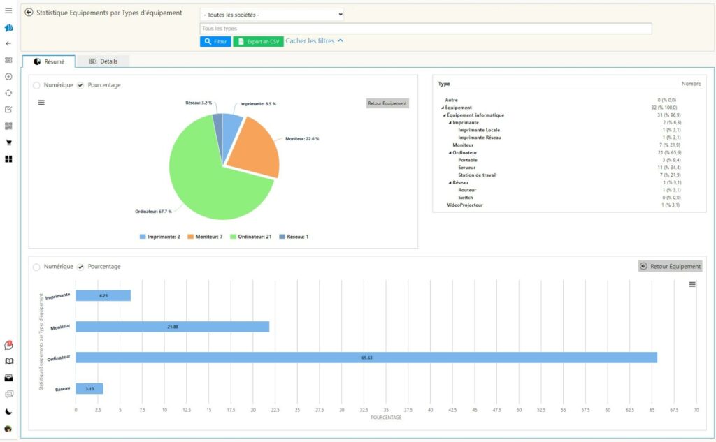 par : Sociétés, Sites, Services, Types d’acquisition, Garanties, Types d’équipement, Ancienneté et renouvellement.