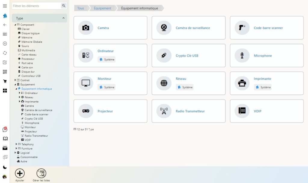 Gérez les différents types d’équipements (mobiliers de bureau, Informatique, Téléphonie, Véhicules, Matériel médical, Outillages, …) ainsi que leurs attributs (format, couleur, …).